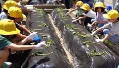 学年で育てるサツマイモの苗を植えました。「サツマイモの葉っぱは、ハートの形に見えるね」「おいしいサツマイモができるといいな」などと話していました。サツマイモの生長も、とても楽しみです。