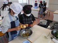 5年生は、ほうれん草やじゃがいもをゆでてみました。ほうれん草やじゃがいもがおいしく食べられるゆで時間を確かめました。安全に気を付けて、友達と一緒に調理しました。