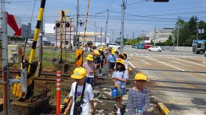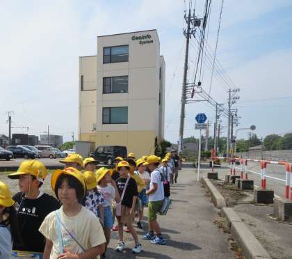学校の南側を探検しました。道幅の広いところにはたくさんの車が行き交っていることや、いろいろな店が集まっているところがあることに驚いていました。萩浦の土地や交通の様子についてたくさん発見することができました。