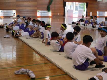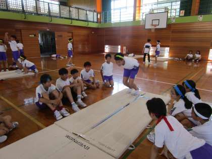 5月下旬から7種目の体力テストに取り組んでいます。今日は、上体起こしと立ち幅跳びを行いました。応援の声が響く中、「一回でも多く」「1cmでも遠くに」という思いで取り組む子供達の姿がたくさん見られました。