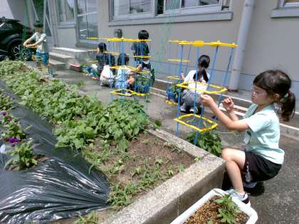 生活科で育てている朝顔が、休日の間にぐんぐん成長していました。今日は、つるが伸びていけるように、支柱を立てました。巻き付きやすいように、つるを優しく支柱に添わせている様子から、朝顔を大切にしている気持ちが伝わります。