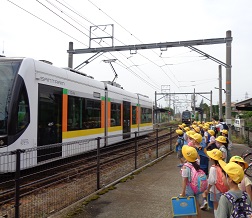 安全に気を付けて歩いています。まずは、ライトレールの萩浦小学校前駅へ。そして、ピンクコースから赤コース方面へ。消防署の前も通りました。