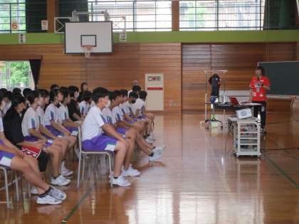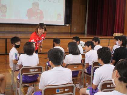 今日は、アランマーレ富山で活躍する横嶋彩選手を招聘し、「夢を叶えよう〜楽しく輝く未来へ挑戦!〜」をテーマに講演をしていただきました。横嶋選手のこれまでの生き方、ハンドボールを通して感じてきたことなど、貴重なお話を聞くことができました。講演後には、ハンドボールの体験もさせていただき、子供達にとって充実した時間でした。横嶋選手から学んだことを大切にしていきたいです。