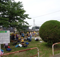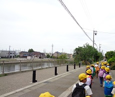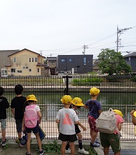 萩浦神社から、どんどん緑コースを進んで行きました。到着したのは住友運河です。「ここで魚が飛び跳ねるんだよ」と教えてくれました。