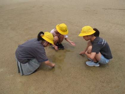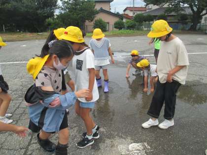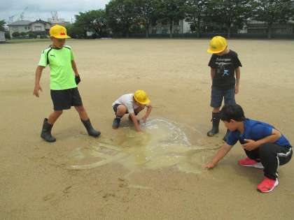 校舎からグラウンドを見ると、水たまりがたくさんできていました。「グラウンドに出て水たまりを見てこよう」と言うとみんな大喜びで、「水たまりがあるところとないところがあるよ」「地面がべちょべちょなところと乾いているところがあるよ」などたくさん発見していました。なぜそうなのか、次の時間に考えていきます。