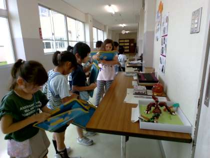 夏休みに頑張って作った作品を見合いました。子どもたちは真剣な表情で、友達や、2年生さんの作った作品のよいところをたくさん見つけていました。