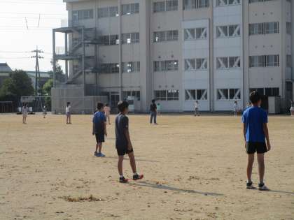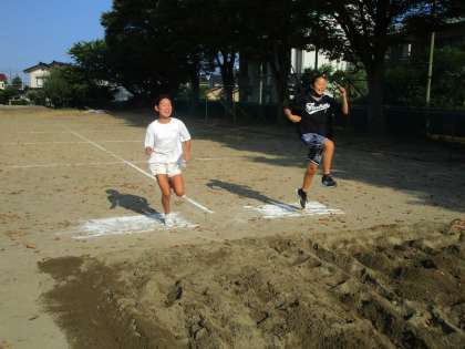 朝、学校へ来るとランドセルを置いてすぐ、チャレンジ陸上記録会へ向けて練習をがんばる6年生です。今日から外での練習を始めました。練習したい種目を選んで、汗だくになるまでがんばっています。