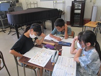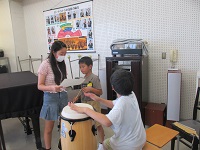音楽科では、打楽器を使ってリズムアンサンブルづくりをしています。どんな順番で鳴らすか、どのような工夫をするか、3人で話し合いながら進めています。
