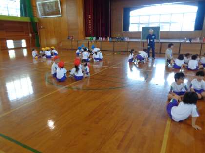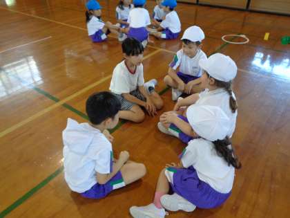 体育では走の運動でしっぽとりをしています。今日は、1組2組でトーナメント戦を行いました。試合の後は、各団で作戦会議をしてどうすればたくさんしっぽを取ることができるか、真剣な表情で話し合っていました。