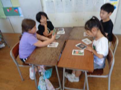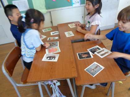 図工の時間に、アートカードを使って鑑賞の学習を行いました。カードを見ながら「見て、手が6本もあるよ」「見方を変えると、男にも女にも見える!」等と、自分の考えたことを素直に話していました。