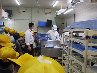 校区内にあるス−パーマーケットに見学に行きました。普段、見ることのできないバックヤードを見せていただきました。果実や肉を保存している大きな冷蔵庫や魚をさばき刺身を作っている様子、すばやくパックにされ、シールを貼り付けていく様子にとても驚いていました。