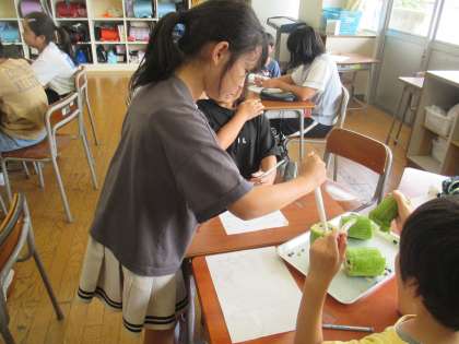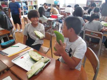 ヘチマの中はどうなっているのか気になったので切ってみました。実によって、種の色や中の様子が違っていて、お互いのヘチマを見比べていました。「ヘチマは食べられるのか」「何に使うのか」など気になったことをクロームブックで調べる子供もいました。