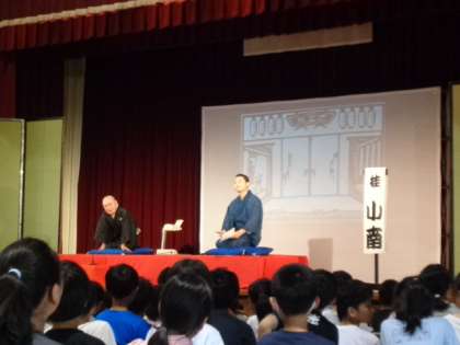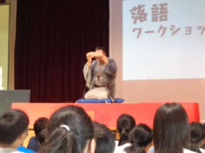 10月1日(火)は、学校巡回講演を行いました。落語家と紙切り芸人の方が来校し、子供たちはワークショップと公演を楽しみました。ワークショップでは、落語家の方に扇子や手ぬぐいを用いた表現を教えていただいたり、紙切り芸人の方に蝶の切り方を教えていただいたりしました。本公演では、落語と紙切りだけでなく、その二つを合わせた新しい芸を見せていただきました。笑い声や驚きの声が起こる楽しい時間になりました。