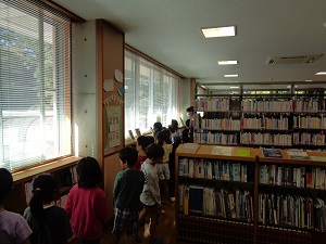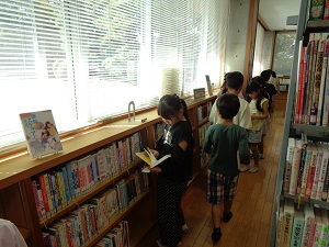 図書館の中をぐるっと回り、自分の読みたい本を選びました。「たくさんあるけど、どれがいいかな。」とじっくり選んでいました。