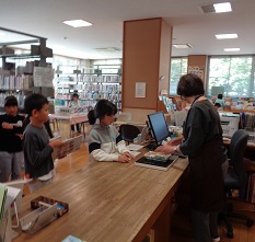 本を選んだら、カウンターへ行って借ります。お話を聞いたとおりに上手にできました。
