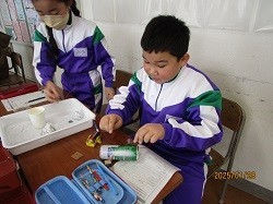 豆電球と乾電池を導線でつなぎ、どんな物が電気を通すのか調べました。はさみやクリップ、机など身近な物を選んで楽しく実験を進めました。
