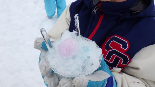 グラウンドにたっぷり積もった雪で遊びました。少し固い雪でしたが、冷やしていた色水でかき氷屋さんをしたり、大きな雪のかたまりを集めてタワーを作ったりして楽しみました。また、雪上をかけ回り、鬼ごっこをする子供もいました。