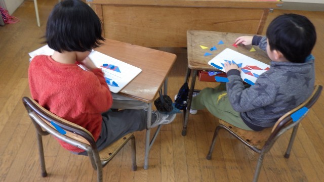 色板を並べて、魚やロケット等を手本を見ながら作ったり、自分で考えた形を友達と見せ合ったりしました。子供たちは、多様な並べ方でいろいろなものを作ることができることに気付きました。