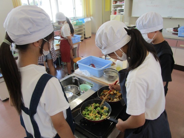 材料の切り方、いためる手順等を計画して実習を行いました。