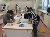家庭科でランチョンマットを作っています。布にしるしをつけて、アイロンで三つ折りに...