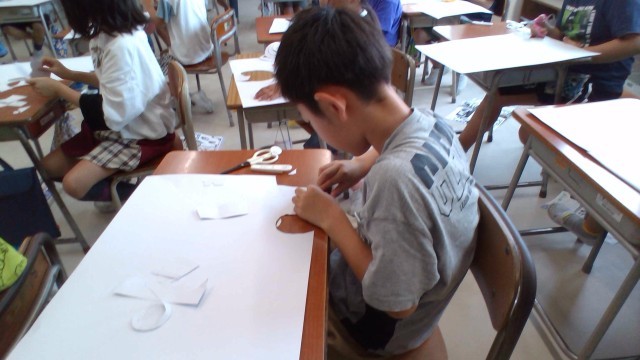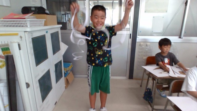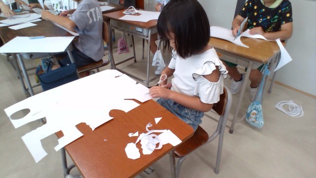 図工科では、はさみを使って切った形から作品をつくりました。紙が渦巻のようになるように切ったり、切った紙を重ねて新しい形を想像したりしました。友達の切った紙を見て、切り方を聞いたり、「その形細かく切っててすごいね」と話す様子も見られました。