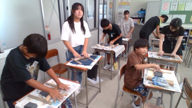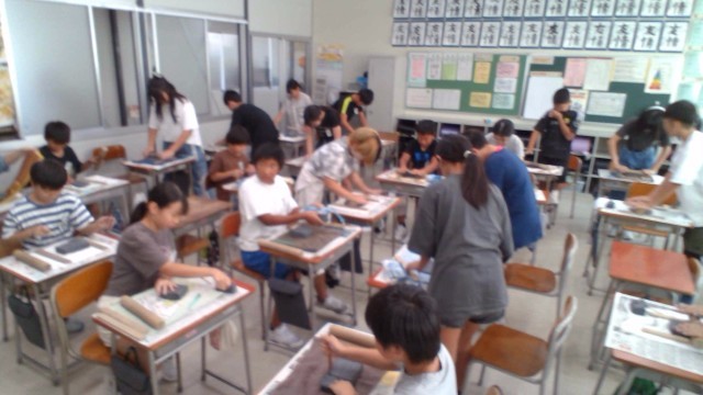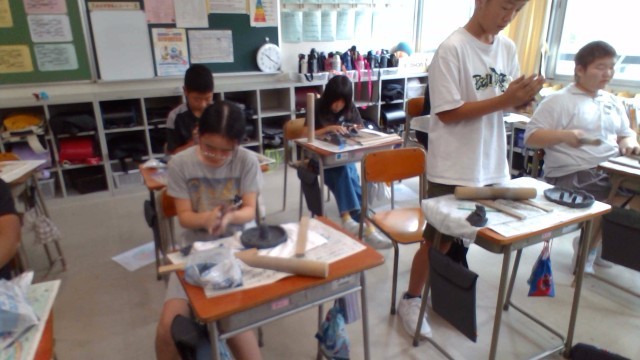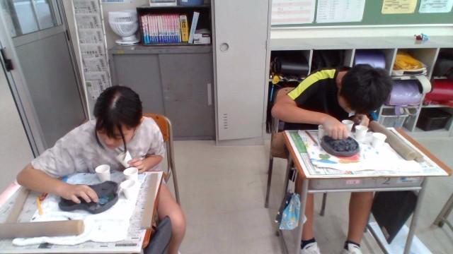 図画工作科で「水の流れのように」の学習で焼き物教室をしました。信楽粘土を使って、自分のイメージする形を作ることができました。水の流れを表現するために4色のガラスを敷き詰めました。この後、乾燥させて焼いてもらって完成となります。完成を楽しみに待ちたいと思います。