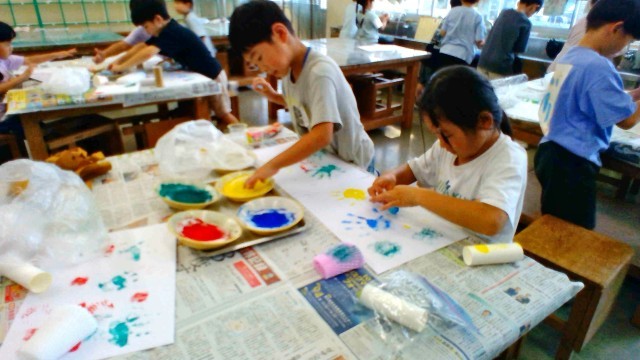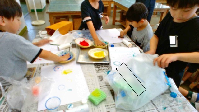 図画工作の時間では、身近な材料にインクを付けてスタンプのように押したり、コロコロ転がしたりして作品を作りました。「上手に押せた!」、「これ押したらどうなるかな?」など、楽しみながら作品を作り上げることができました。
