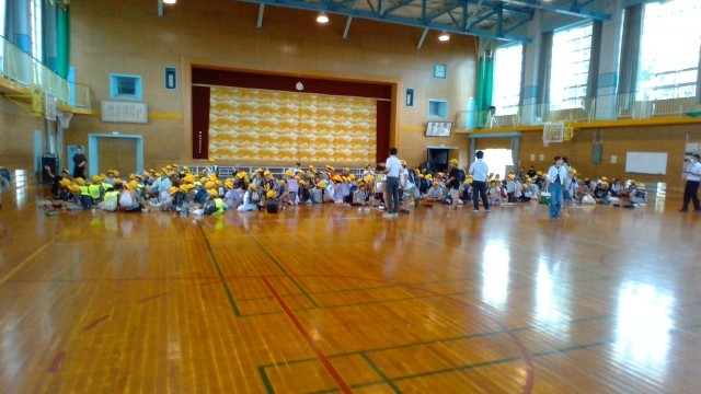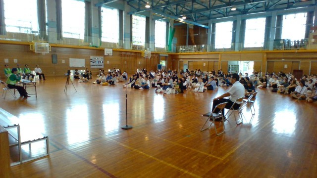 学習参観の後の「熊対応講習会」では、地域の防犯組合連合会の会長さんから、熊が餌を求めるこれからの季節にどうすれば自分の命を守れるかを教えていただきました。保護者の方々は体育館で、子供たちはオンライン接続をした教室で、しっかりと話を聞くことができました。