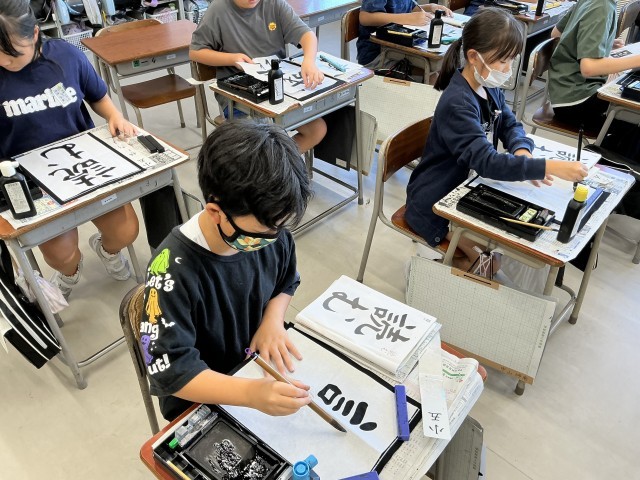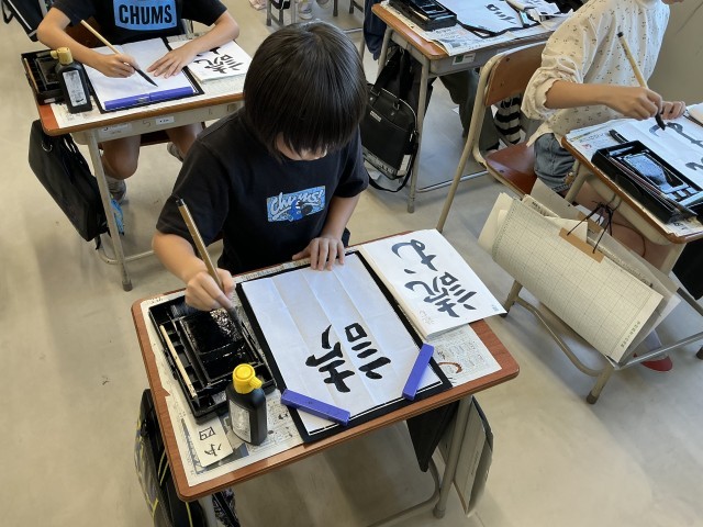 書写では「読む」という字を書いています。漢字と平仮名の大きさのバランスに気を付け、丁寧に書き上げました。