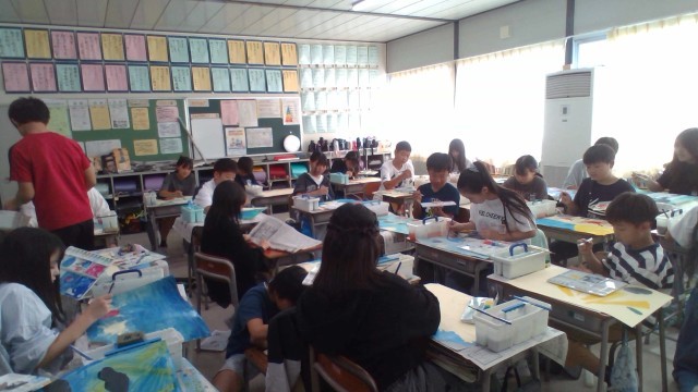 図画工作科では、「言葉から想像を広げて」の学習で、「やまなし」の作品から想像して絵を描いています。光の表現等を工夫しながら色を塗っています。