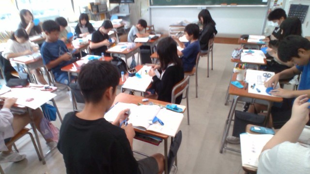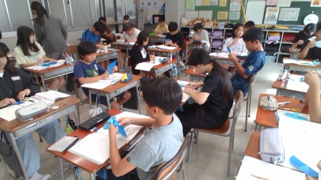 算数科では、「円の面積」の学習をしています。円の面積の公式を考えるために、円を細かく等分して、長方形の形に近づけていきました。