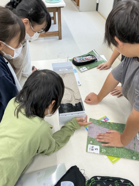 理科では流れる水のはたらきについて学習をしています。同じ川にも関わらず流れる場所によって様子が違うことを確かめ、それは流れる水のはたらきによるものではないかという予想のもと実験を行いました。流れる水には様々なはたらきがあることを実験を通して学びました。