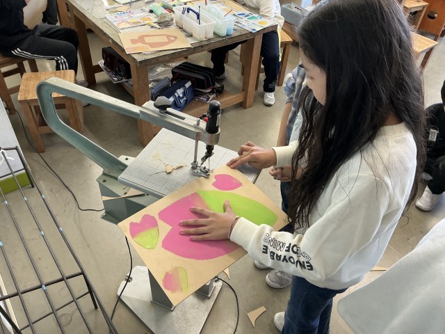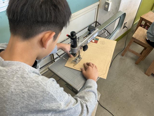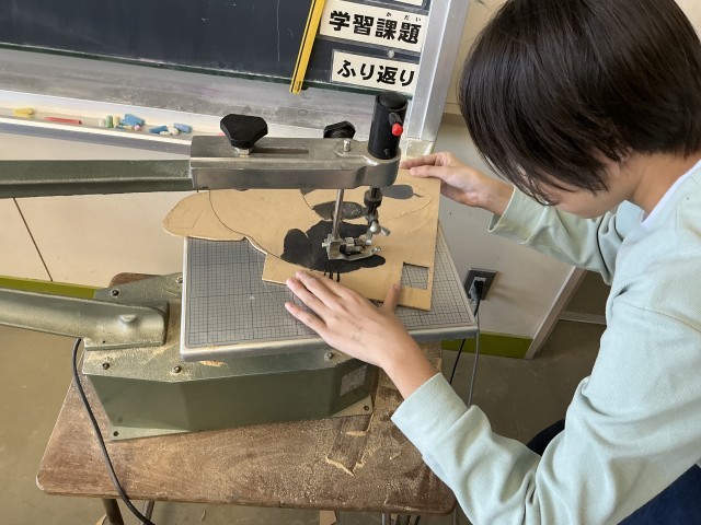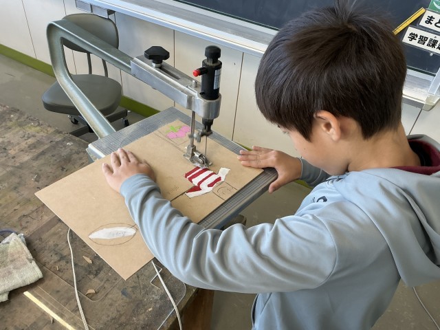 図画工作科の学習では、電動糸のこぎりを使ってホワイトボードを作成しています。初めて使う糸のこぎりに苦戦しながらも、糸のこぎりならではの切れ方を生かして、形を工夫しながら作成してます。
