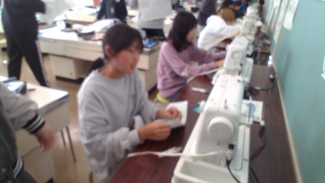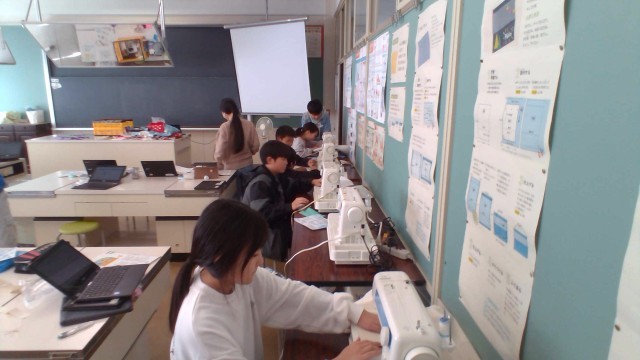 家庭科では、ミシン等を使い、ナップサックやトートバッグを作っています。ミシンの使い方に苦戦しながらも、教科書を見ながら取り組む姿が見られました。完成が楽しみです。