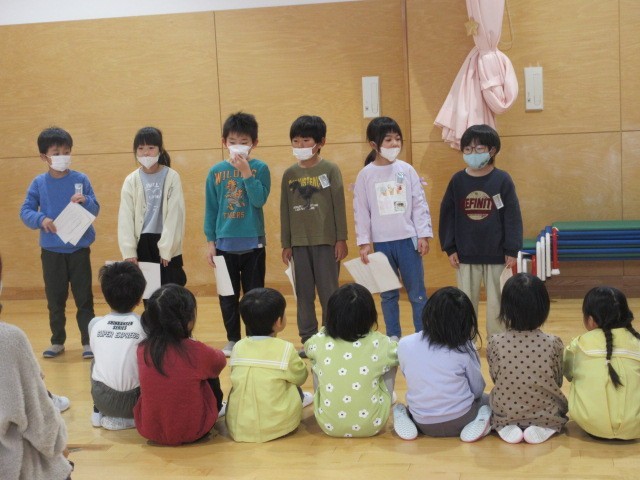 生活科の時間に、どんぐりや松ぼっくり、落ち葉を使っておもちゃ作りをしています。そして自分たちで作ったおもちゃを持って、くまのこども園の年長さんと交流を行いました。おもちゃの遊び方を説明してあげたり、優しく声をかけたり、お兄さんお姉さんらしい姿がたくさん見られました。