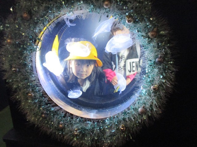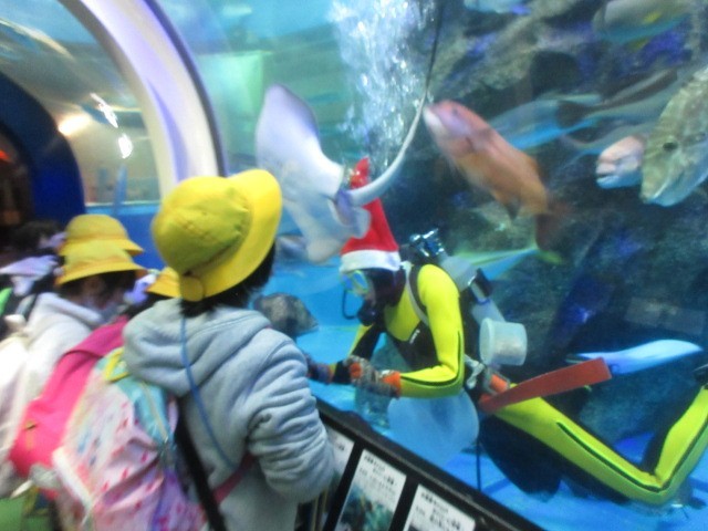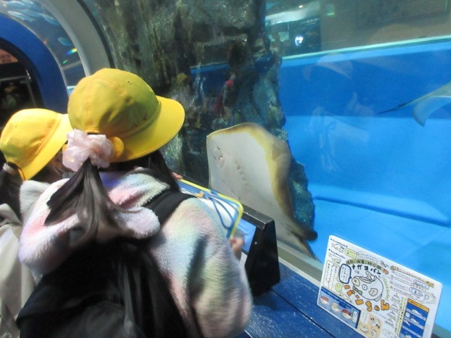 校外学習で魚津水族館に行ってきました。大きな水槽の中で泳ぐ生き物を見たり、友達と協力してクイズを解いたりしました。たくさんの種類の生き物を見て、「色々な色の魚がたくさんいるね」「飼育員さんに水槽の中から手を振ってもらってうれしいな」「スイミーもいるかな」と楽しそうに活動していました。