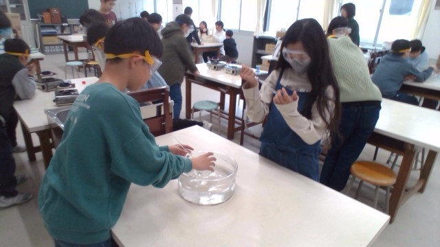 理科の授業では、物の溶け方について学習しています。水に溶けて、見えなくなった物を取り出すためにはどうすればいいのか、予想を立ててから実験しました。水溶液を蒸発させたり冷やしたりすると物を取り出すことができると、実験を通して捉える子供たちです。
