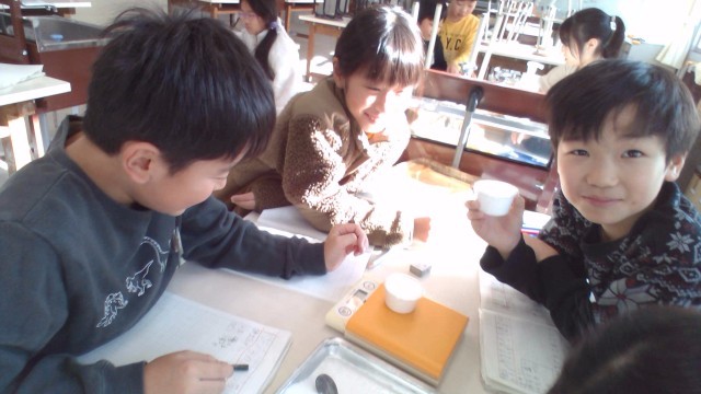 理科では、物の重さについて学習しています。今日は同じ体積の塩と砂糖の重さを比べました。