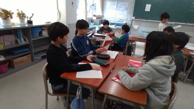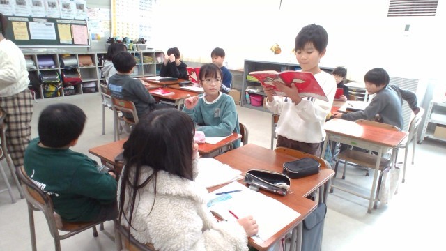 国語の学習では、いろいろな詩を読み、それぞれの工夫や面白さについてグループの友達と話しました。「わたしも同じこと思ったよ」「そうだよね」と共感しながら友達の話に耳を傾けていました。