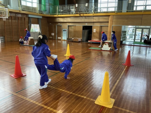 体育では体つくり運動を行っています。体力テストの結果や運動をしてみて見付けた自分の課題を解決するべく、友達と協力しながら、パワー、テクニック、スタミナ、ストレッチの4つのコーナーで様々な運動をしています。