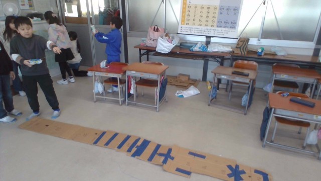 生活科では、来週、他のクラスの友達をおもちゃランドに招待します。おもちゃの動かし方や遊び方のルールを説明できるよう、同じクラスの友達に遊んでもらい、準備を進めました。