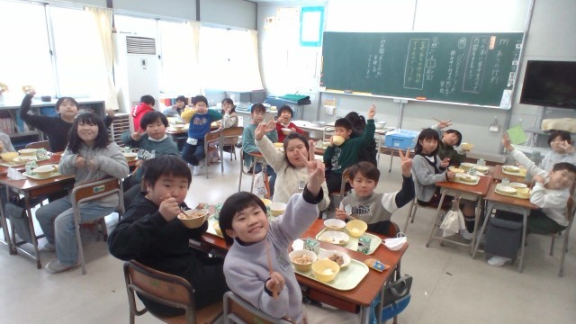 今週は給食週間です。給食週間特別献立を楽しみにしている子供たちは、わくわくしながら献立表を見ています。「今日もおいしいね!」と笑顔で給食を食べていました。