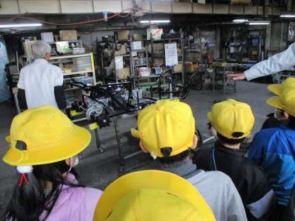 タケオカ自動車工芸では、車が作られる様子を見学させていただきました。車にはたくさんの部品が使われていることを知り、驚いていました。