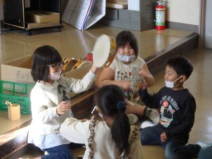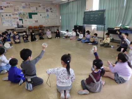 音楽科「いろいろなおとをみつけてならそう」では、トライアングルや鈴、タンブリンの楽器の鳴らし方を工夫して、いろいろな音を見付けました。その後、見付けた音を使ってお話をしたりまねっこをしたりして楽しみました。