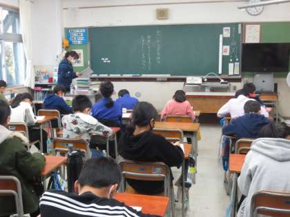 今日は、人権に関する作文を放送委員に読んでもらいました。テーマは「思いやり」です。思いやりの心をもって、友達とつきあうことの大切さを学びました。話を聞いた後、各クラスで、自分が感じたことを書きました。