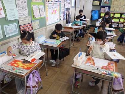 図工「おはなしからうまれたよ」では、久しぶりに水彩絵の具を使って絵を描きました。想像したことを工夫して表現しました。