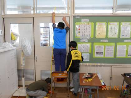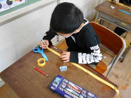 算数科で、長さの学習をしています。これまでに習った、ミリメートル、センチメートルに加えてメートルの単位が出てきました。手作りの長いものさしを使って、さっそく教室のいろんな場所を測っていました。