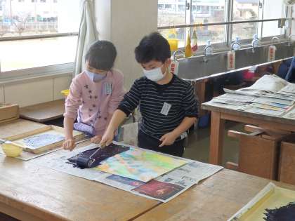 図工のシールローラー版画では、仕上げのローラーに取り組みました。