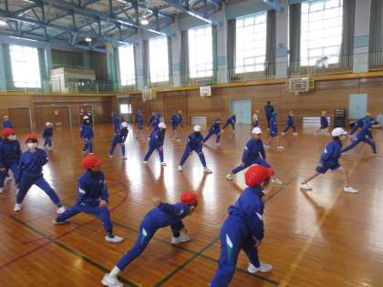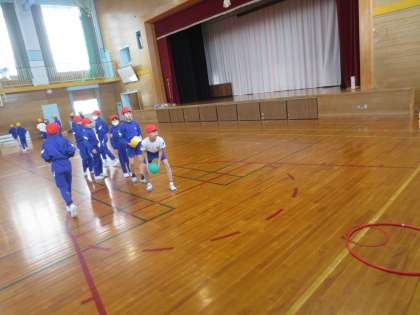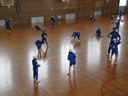 子供たちは、柔軟を取り入れた準備運動やボールを使った活動など、様々な体つくり運動に親しみました。