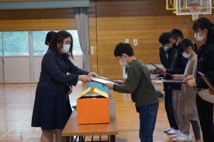 6学年委員長の方からタイムカプセル委員に委嘱状を渡していただいた後、代表の子供が全員の手紙をタイムカプセルに入れました。成人を迎えて開封する日が楽しみです。